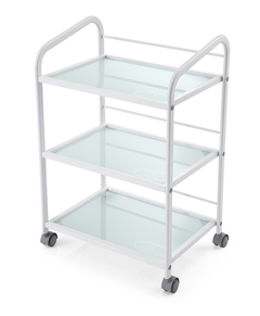 Metalowy stół z półkami ze szkła hartowanego. W konstrukcję stołu wbudowany jest otwór do mocowania lampy.